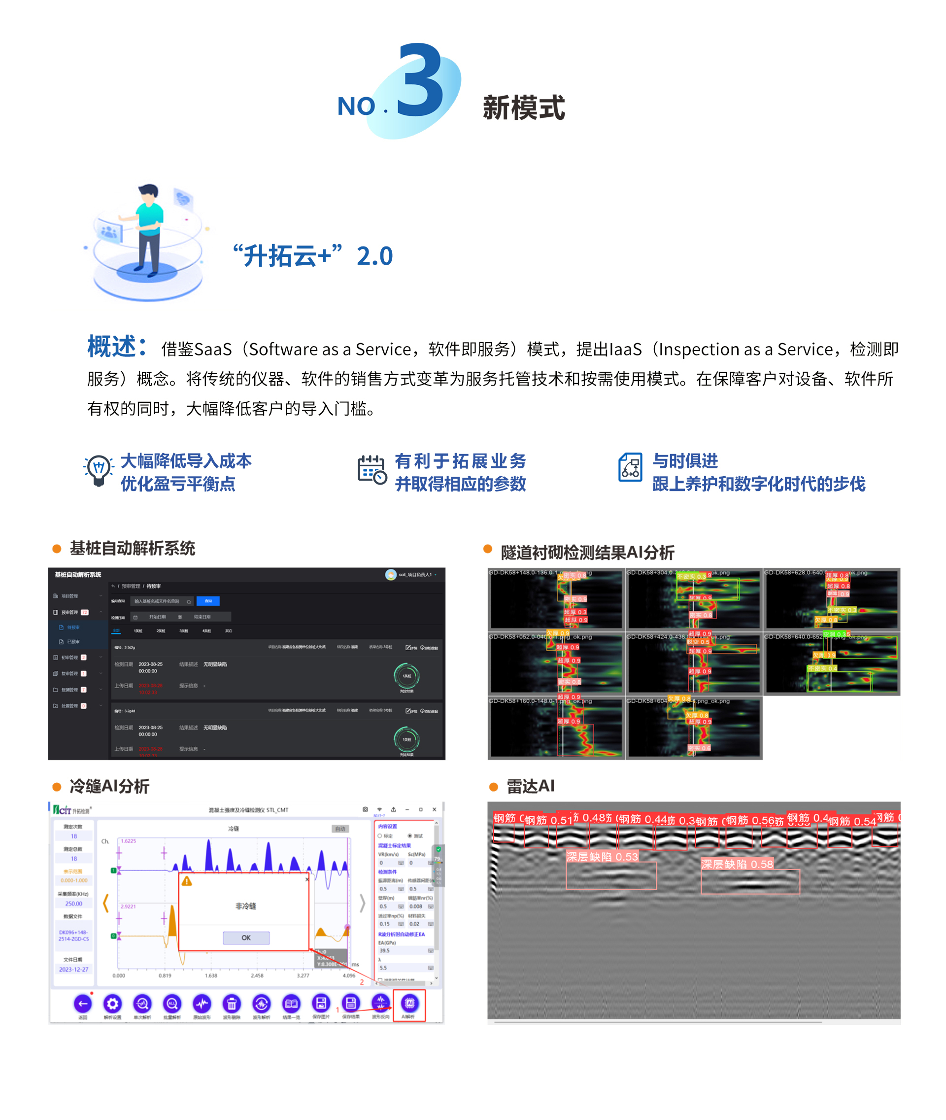 如何用科技手段服务于企业提质、增效、降本?用信息技术为企业带来便捷?真正符合企业需求的工程试验检测模式是怎样的?“升拓云+2.0”数智试验与检、监测合作伙伴,一个灵活的、便捷的、个性化的、用户友好的服务模式已上线。     01   升拓云+2.0:创新型服务模式的开起   以 AGI 为代表的数智化时代,以及建设行业的“新常态”,为工程试验检测行业带来了前所未有的机遇和巨大的挑战。为此,我公司愿与您携手结成合作伙伴,以数十年的技术积累为基础,开放和互利共赢的心态而形成崭新的商业模式,进而促进企业的提质(能力及品质)、增效(效率及效益)、降本(采购成本及运营成本)。       02   升拓云+2.0:全面升级的智慧化解决方案   升拓检测提供数智化试验检测设备、工程物联网系统、分析管理软件以及人员培训等全方位的合作,涉及100余款产品、系统和软件。   数智化试验检测设备:数智化试验、检测设备(含混凝土及预应力结构、岩土、桩柱杆等5大类):合作伙伴拥有设备产权并取得相关能力、参数,随使用量支付软件服务费。   工程物联网系统:工程物联网系统(含边坡、桥、隧、结构等各类基础设施监测):我司为合作伙伴提供全面技术(软、硬件及现场作业)指导,助力合作伙伴获取项目实施能力。我司牵头 “集中采购”模式,大幅降低外购成本。   管理、智能分析软件:管理、智能分析软件(含试验数据和报告自动处理和上传、人员、设备、项目等信息管理等):采用 SaaS(软件即服务)模式,随使用时间支付软件服务费。   03   升拓云+2.0:创新力量与市场智慧的完美融合   我们将复杂硬件简化为精炼高效的组件,大幅度降低导入成本,优化盈亏平衡点,有利于取得相应的参数,让您在享受高品质服务的同时,无需承担高昂的设备投入,真正做到轻装上阵,让资金流更顺畅地助力您的业务扩张。合作伙伴可以极低的初期投入,大幅扩展业务范围和能力。借助同步获取最新的数智化技术,可有效降低各类成本,促进企业的升级和发展。   检测参数的大幅扩充:可增加数十项 CMA 参数。   极低的初期投入成本:对于工程无损检测设备,其初期投入最低仅为常规采购方式的20%,而分析、管理类软件,其初期投入最低为零。   使用成本封顶:当合作伙伴的整体付费超过设备及软件的市场价时,自动转为买断型模式,不再继续付费。   工程物联网业务的参入及拓展:低风险、低投入涉足工程物联网领域,并通过集中采购的模式,对传感器等物料成本有望最高节约50%以上。   运营效率的提升:通过引入表单型试验数据的自动分析、实测实量等报告的自动归档分析等现代化手段,可数十倍、数百倍地提升工作效率。   数字赋能企业升级:通过引入 AI、数字孪生等技术,企业数字化能力和形象可得到有效提升。     04   升拓云+2.0:“服务+产品”模式典型案例   在新的营销模式中,我们将提供三种灵活的选项以适应不同的用户需求。   第一种--直接买断模式:客户可以像传统的销售模式一样,直接购买设备和软件的永久使用权。这种模式下,客户一次性支付全部费用,设备和软件的使用权即被完全转移给客户。   第二种--预付费充值模式:用户以较低的成本价购买设备,该设备包含足够数量的数据采集次数。当这些次数用完后,用户可以根据实际接到的业务需求,对设备进行灵活充值以继续使用。当设备的累积使用金额达到直接买断的价格,用户便可以享受该设备上的软件数据采集和分析功能的终身免费使用权。   第三种--基础充值模式:客户以极低的成本价购买设备,该设备包含一定数量的数据采集次数,足以满足基本的升甲等参数和使用需求。与第二种模式类似,当提供的数据采集次数耗尽时,客户可以依据业务需求进行充值,软件正常使用。当设备的累积使用金额超过直接买断的价格,客户同样可以获得该设备上软件数据采集和分析功能的终身免费使用权。   新型锚杆设备——三种模式间的横向对比 配置及服务 模式一 模式二 模式三 主机及配套 ✓ ✓ ✓ 线上培训 售后检测操作视频 首次计量服务 ✓ ✓ ✓ 平板电脑 ✓ ✓ ✕ 检测能力提升服务 ✓ ✓ ✕ 免费线下服务(次) 1 1 ✕ 硬件所有权 ✓ ✓ ✓ 软件数据分析模块使用权(次) 终身 免费使用 终身 免费使用 终身 免费使用 软件数据采集模块使用权(次) 终身 免费使用 4000 240 单一模式下预计可完成检测数量(根) ∞ 500 30   05   未来,“服务+产品”模式充满潜力 随着企业上云的脚步加快,云服务成为企业的刚需。在企业需求的强驱动下 “服务+产品“模式的价值会日益明显。   从服务的角度来看,对于计划上云的企业前期的咨询、架构设计、中期的部署实施等服务显得尤为重要。2023年2月,中共中央、国务院印发《数字中国建设整体布局规划》,强调数字中国建设是推进中国式现代化的重要引擎,是构筑国家竞争新优势的关键。数字产业已成为工程行业创新最活跃的领域,为行业带来新的转型方向和增长点。对于全周期的“服务”需求会更加强烈,与之对应的“服务+产品”模式价值也将更加凸显。   从产品的角度来看,考虑到越来越多企业用户的需求,云服务的运维方式也从自动化向智能化演进。在帮助企业在规模、效率和复杂度方面挑战的更好的解决方案。“升拓云+2.0”不仅仅是一个服务升级,它代